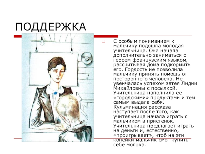 заниматься с героем французским языком, рассчитывая дома подкормить его. Гордость не позволила мальчику принять помощь от постороннего человека. Не увенчалась успехом затея Лидии Михайловны с посылкой. Учительница наполнила ее «городскими» продуктами и тем самым выдала себя.