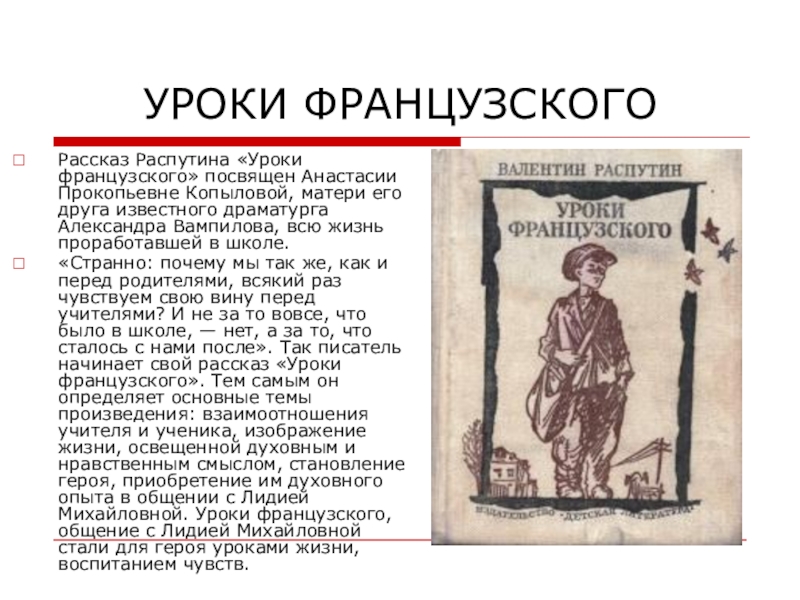 «Странно: почему мы так же, как и перед родителями, всякий раз чувствуем свою вину перед учителями? И не за то вовсе, что было в школе, — нет, а за то, что сталось с нами после». Так писатель начинает свой рассказ «Уроки французского». Тем самым он определяет основные темы произведения: взаимоотношения учителя и ученика, изображение жизни, освещенной духовным и нравственным смыслом, становление героя, приобретение им духовного опыта в общении с Лидией Михайловной. Уроки французского, общение с Лидией Михайловной стали для героя уроками жизни, воспитанием чувств.