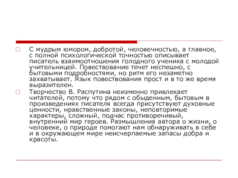 Творчество В. Распутина неизменно привлекает читателей, потому что рядом с обыденным, бытовым в произведениях писателя всегда присутствуют духовные ценности, нравственные законы, неповторимые характеры, сложный, подчас противоречивый, внутренний мир героев. Размышления автора о жизни, о человеке, о природе помогают нам обнаруживать в себе и в окружающем мире неисчерпаемые запасы добра и красоты.