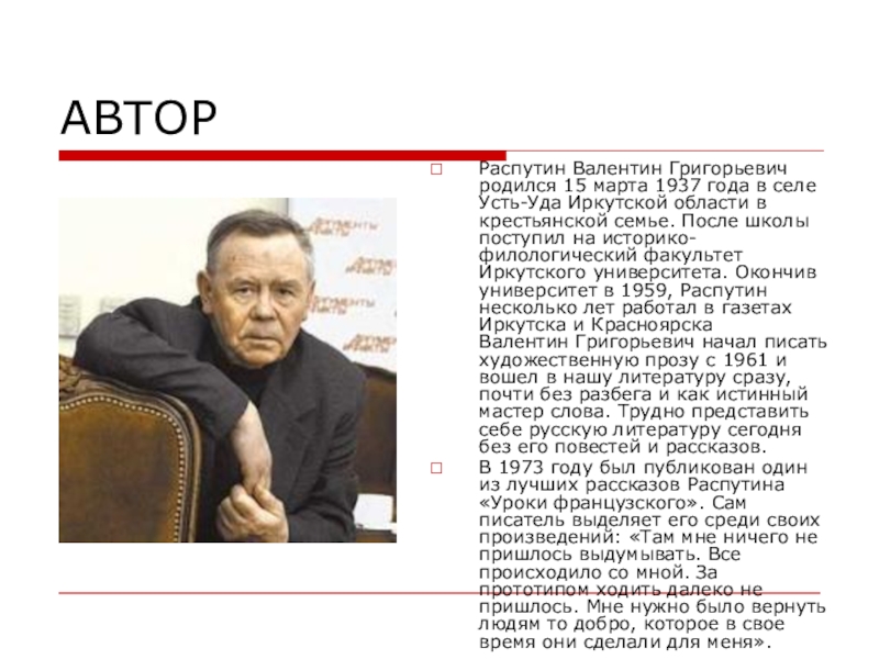 В 1973 году был публикован один из лучших рассказов Распутина «Уроки французского». Сам писатель выделяет его среди своих произведений: «Там мне ничего не пришлось выдумывать. Все происходило со мной. За прототипом ходить далеко не пришлось. Мне нужно было вернуть людям то добро, которое в свое время они сделали для меня».