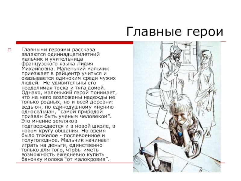 Лидия Михайловна. Маленький мальчик приезжает в райцентр учиться и оказывается одиноким среди чужих людей. Не удивительны его неодолимая тоска и тяга домой. Однако, маленький герой понимает, что на него возложены надежды не только родных, но и всей деревни: ведь он, по единодушному мнению односельчан, “самой природой призван быть ученым человеком”. Это мнение земляков подтверждается и в новой школе, в новом кругу общения. Но время было тяжелое - послевоенное и полуголодное. Мальчик начинает играть на деньги, единственно только для того, чтобы иметь возможность ежедневно купить баночку молока “от малокровия”.