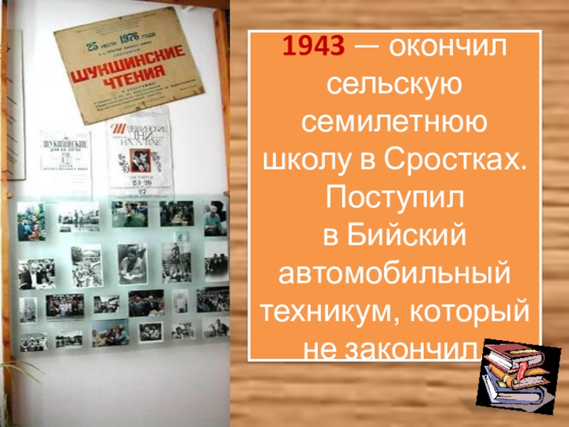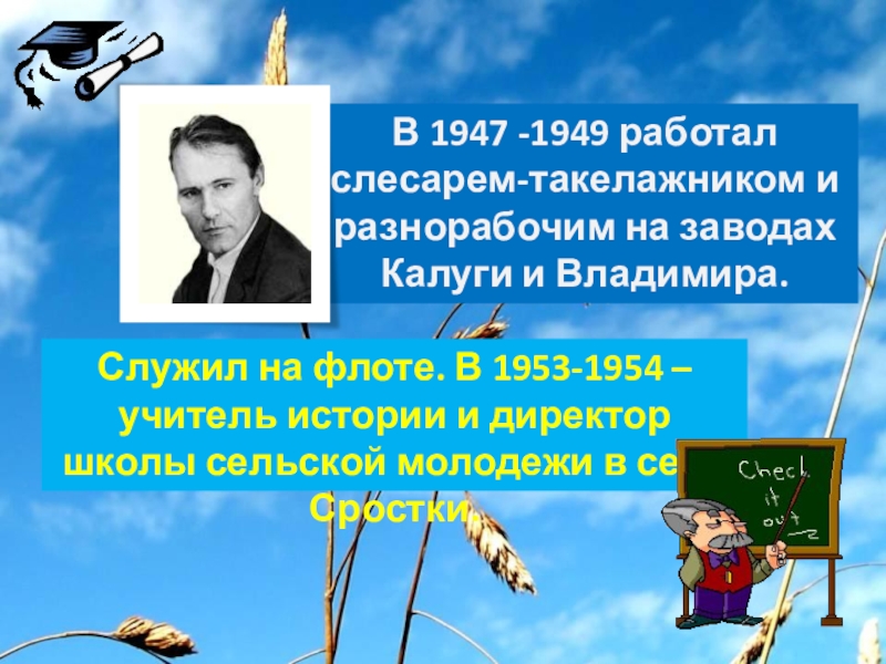 Служил на флоте. В 1953-1954 – учитель истории и директор школы сельской молодежи в селе Сростки.