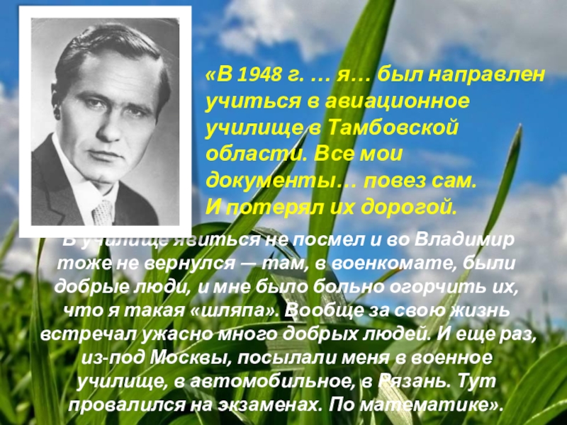 «В 1948 г. … я… был направлен учиться в авиационное училище в Тамбовской области. Все мои документы… повез сам. И потерял их дорогой.