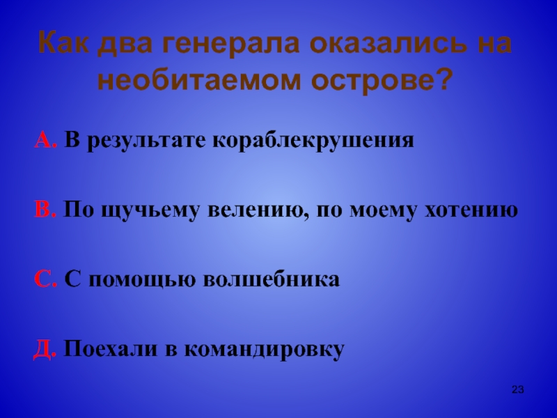 как оба были легкомысленны, то в скором времени, по щучьему велению, по моему хотению, очутились на необитаемом острове.