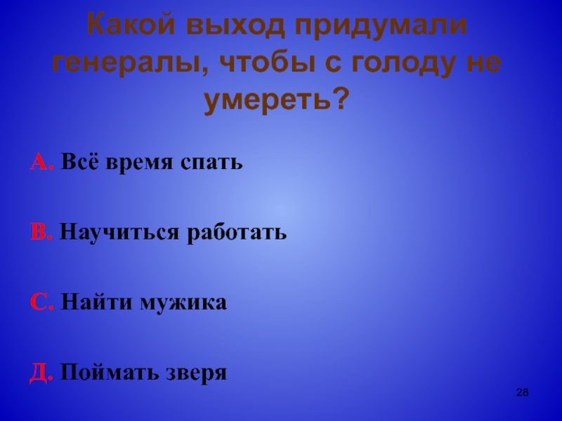 Слайд 28Какой выход придумали генералы, чтобы с голоду не умереть?