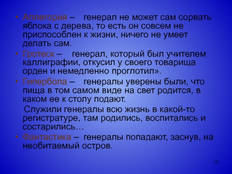 Слайд 13Аллегория – генерал не может сам сорвать яблока с дерева, то есть
