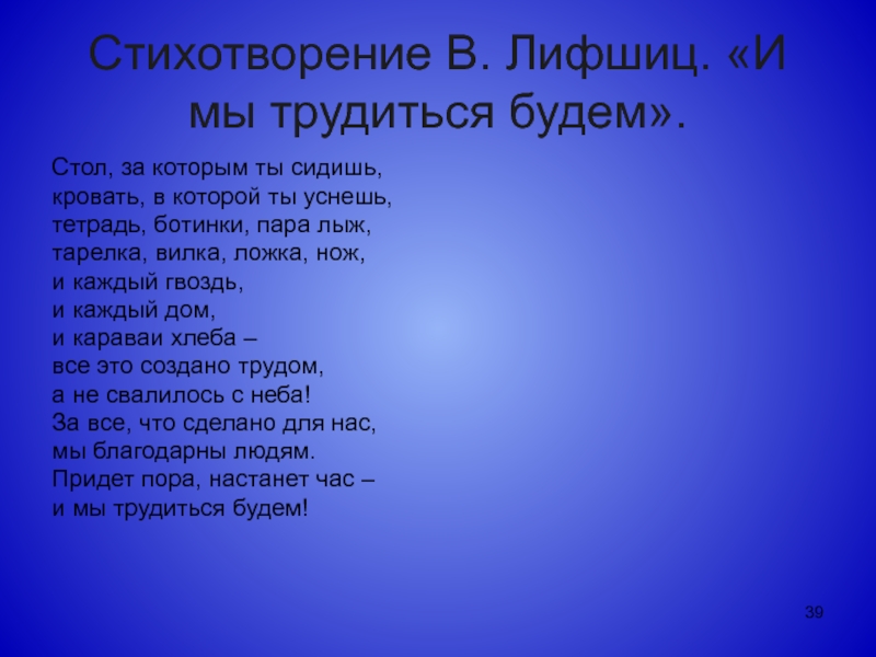 Слайд 39Стихотворение В. Лифшиц. «И мы трудиться будем».