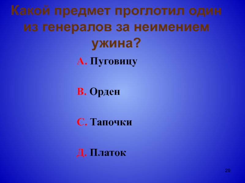 Слайд 29Какой предмет проглотил один из генералов за неимением ужина?