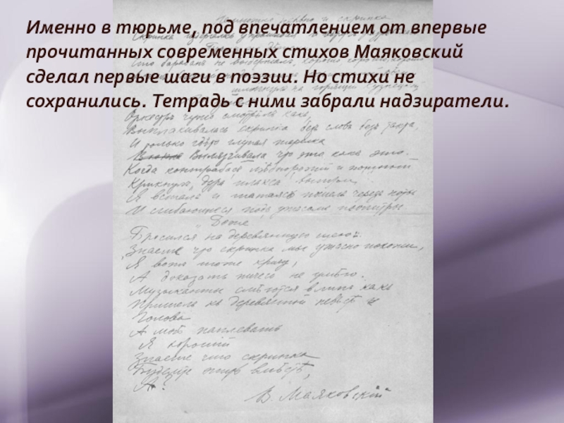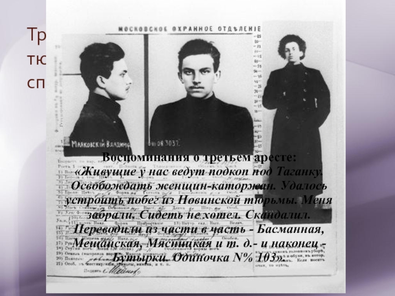 Воспоминания о третьем аресте: «Живущие у нас ведут подкоп под Таганку. Освобождать женщин-каторжан. Удалось устроить побег из Новинской тюрьмы. Меня забрали. Сидеть не хотел. Скандалил. Переводили из части в часть - Басманная, Мещанская, Мясницкая и т. д.- и наконец - Бутырки. Одиночка N% 103».