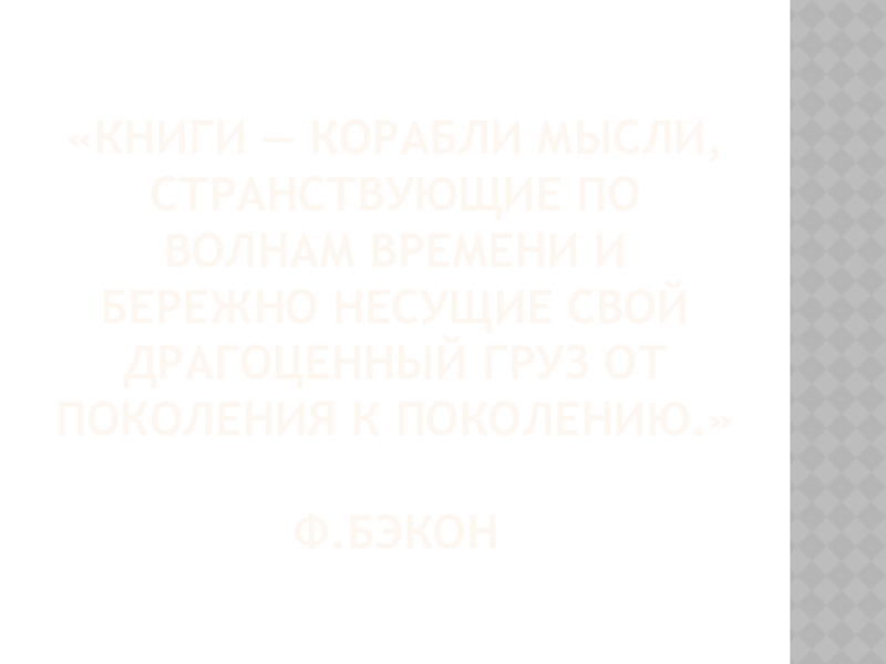 Слайд 13«Книги — корабли мысли, странствующие по волнам времени и бережно несущие