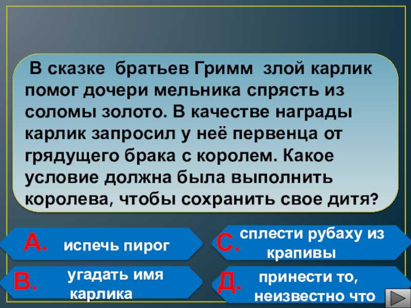 В сказке братьев Гримм злой карлик помог дочери мельника спрясть из соломы золото. В качестве награды карлик запросил у неё первенца от грядущего брака с королем. Какое условие должна была выполнить королева, чтобы сохранить свое дитя?
