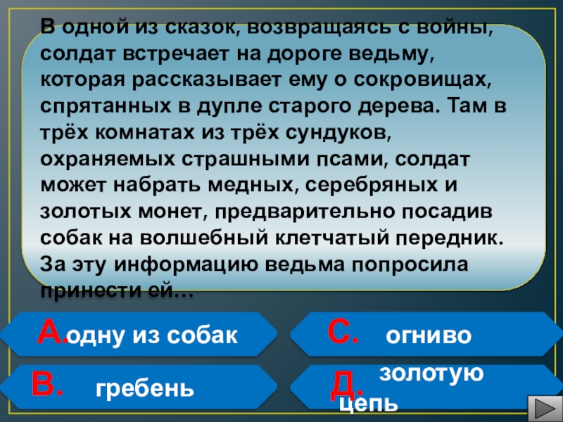 В одной из сказок, возвращаясь с войны, солдат встречает на дороге ведьму, которая рассказывает ему о сокровищах, спрятанных в дупле старого дерева. Там в трёх комнатах из трёх сундуков, охраняемых страшными псами, солдат может набрать медных, серебряных и золотых монет, предварительно посадив собак на волшебный клетчатый передник. За эту информацию ведьма попросила принести ей…