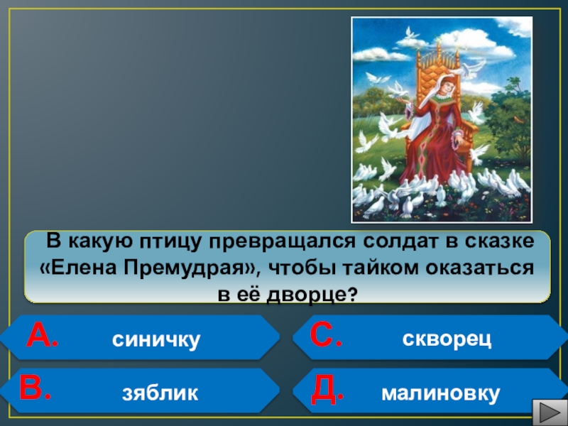 В какую птицу превращался солдат в сказке «Елена Премудрая», чтобы тайком оказаться в её дворце?