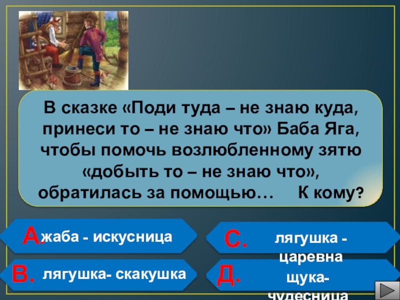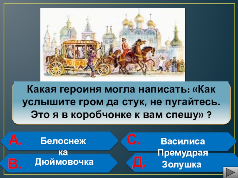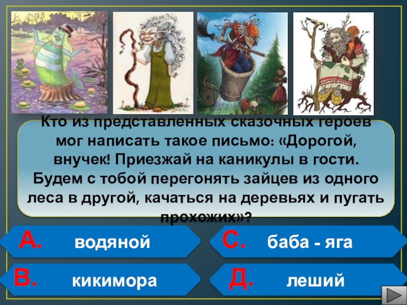 Кто из представленных сказочных героев мог написать такое письмо: «Дорогой, внучек! Приезжай на каникулы в гости. Будем с тобой перегонять зайцев из одного леса в другой, качаться на деревьях и пугать прохожих»?