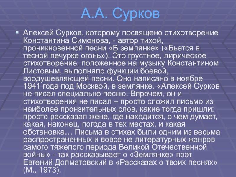 проникновенной песни «В землянке» («Бьется в тесной печурке огонь»). Это грустное, лирическое стихотворение, положенное на музыку Константином Листовым, выполняло функции боевой, воодушевляющей песни. Оно написано в ноябре 1941 года под Москвой, в землянке. «Алексей Сурков не писал специально песню. Впрочем, он и стихотворения не писал – просто сложил письмо из наиболее пронзительных слов, какие тогда пришли; просто рассказал жене, где находится, о чем думает, какая, наконец, погода в тех местах, и какая обстановка… Письма в стихах были одним из весьма распространенных и вовсе не литературных жанров самого тяжелого периода Великой Отечественной войны» - так рассказывает о «Землянке» поэт Евгений Долматовский в «Рассказах о твоих песнях» (М., 1973).