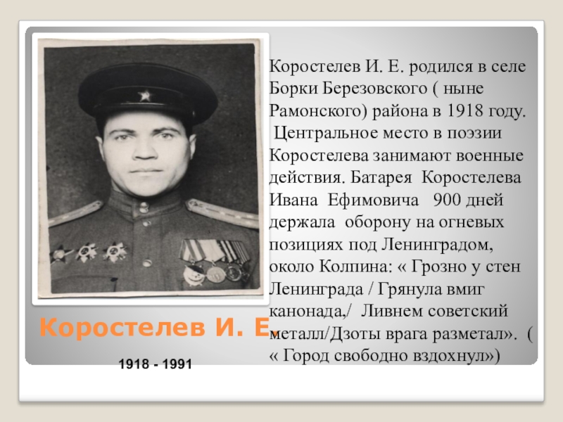 Центральное место в поэзии Коростелева занимают военные действия. Батарея Коростелева Ивана Ефимовича 900 дней держала оборону на огневых позициях под Ленинградом, около Колпина: « Грозно у стен Ленинграда / Грянула вмиг канонада,/ Ливнем советский металл/Дзоты врага разметал». ( « Город свободно вздохнул»)