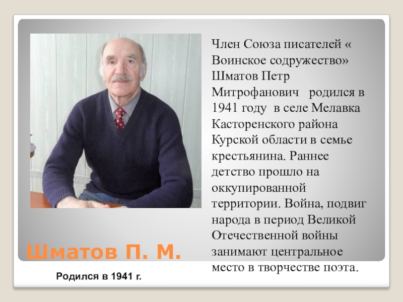 Шматов Петр Митрофанович родился в 1941 году в селе Мелавка Касторенского района Курской области в семье крестьянина. Раннее детство прошло на оккупированной территории. Война, подвиг народа в период Великой Отечественной войны занимают центральное место в творчестве поэта.