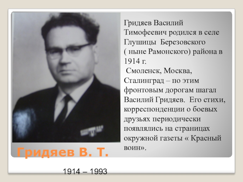Смоленск, Москва, Сталинград – по этим фронтовым дорогам шагал Василий Гридяев. Его стихи, корреспонденции о боевых друзьях периодически появлялись на страницах окружной газеты « Красный воин».