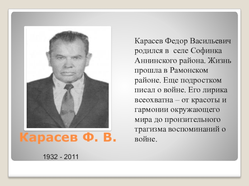 Аннинского района. Жизнь прошла в Рамонском районе. Еще подростком писал о войне. Его лирика всеохватна – от красоты и гармонии окружающего мира до пронзительного трагизма воспоминаний о войне.