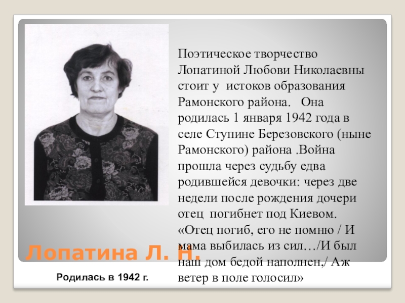 у истоков образования Рамонского района. Она родилась 1 января 1942 года в селе Ступине Березовского (ныне Рамонского) района .Война прошла через судьбу едва родившейся девочки: через две недели после рождения дочери отец погибнет под Киевом. «Отец погиб, его не помню / И мама выбилась из сил…/И был наш дом бедой наполнен,/ Аж ветер в поле голосил»