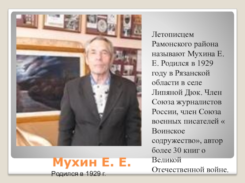 Летописцем Рамонского района называют Мухина Е. Е. Родился в 1929 году в Рязанской области в селе Липяной Дюк. Член Союза журналистов России, член Союза военных писателей « Воинское содружество», автор более 30 книг о Великой Отечественной войне.