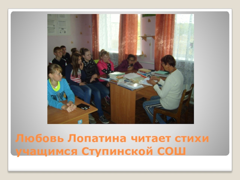 Слайд 30Любовь Лопатина читает стихи учащимся Ступинской СОШ