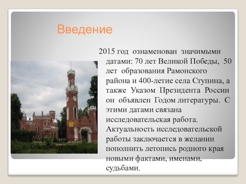 год ознаменован значимыми датами: 70 лет Великой Победы, 50 лет образования Рамонского района и 400-летие села Ступина, а также Указом Президента России он объявлен Годом литературы. С этими датами связана исследовательская работа. Актуальность исследовательской работы заключается в желании пополнить летопись родного края новыми фактами, именами, судьбами.