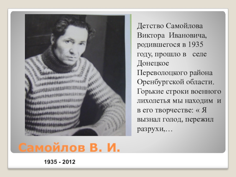 году, прошло в селе Донецкое Переволоцкого района Оренбургской области. Горькие строки военного лихолетья мы находим и в его творчестве: « Я вызнал голод, пережил разрухи,…