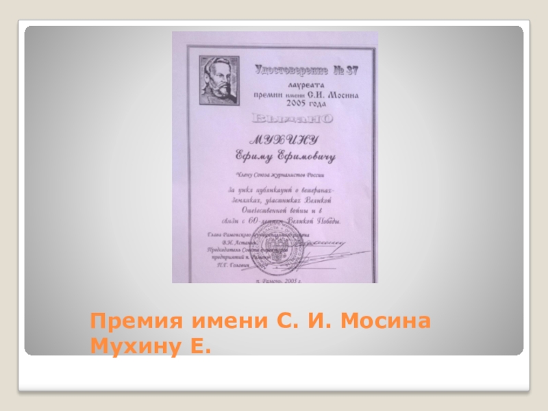 Слайд 17Премия имени С. И. Мосина Мухину Е.