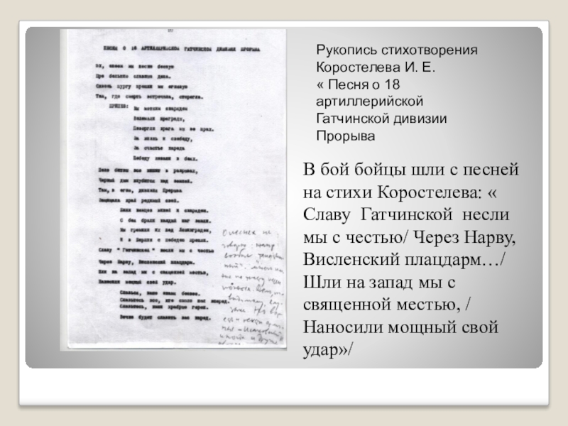 В бой бойцы шли с песней на стихи Коростелева: « Славу Гатчинской несли мы с честью/ Через Нарву, Висленский плацдарм…/ Шли на запад мы с священной местью, / Наносили мощный свой удар»/