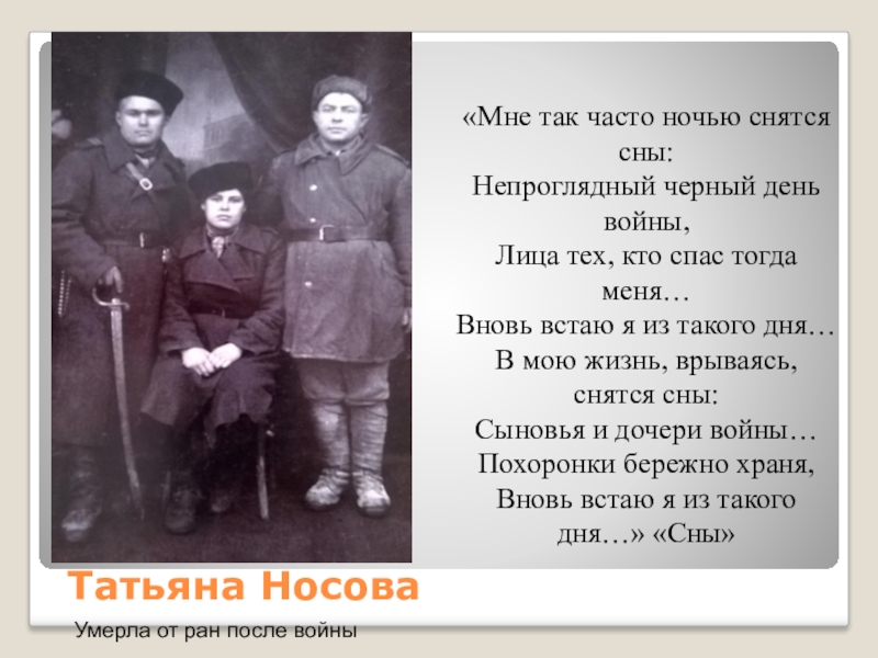 « Военное детство, голодное детство…/ Сиротская доля у многих у нас!/ От горькой беды никуда нам не деться:/ Отцов вспоминали – и слезы из глаз!..»