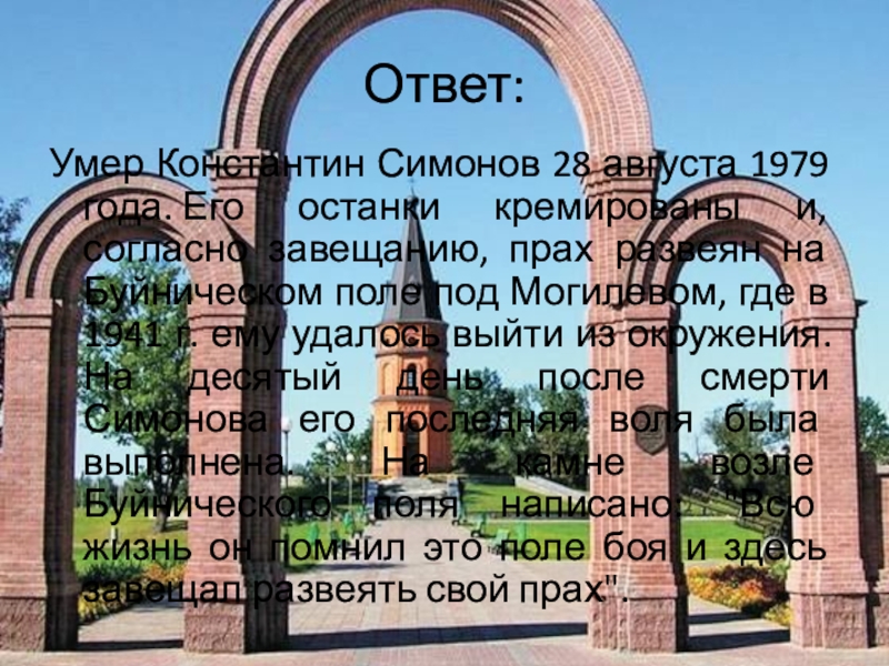 Ответ:Умер Константин Симонов 28 августа 1979 года. Его останки кремированы и, согласно завещанию, прах развеян на Буйническом поле