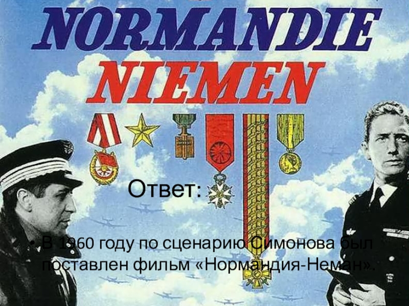 Ответ:В 1960 году по сценарию Симонова был поставлен фильм «Нормандия-Неман».