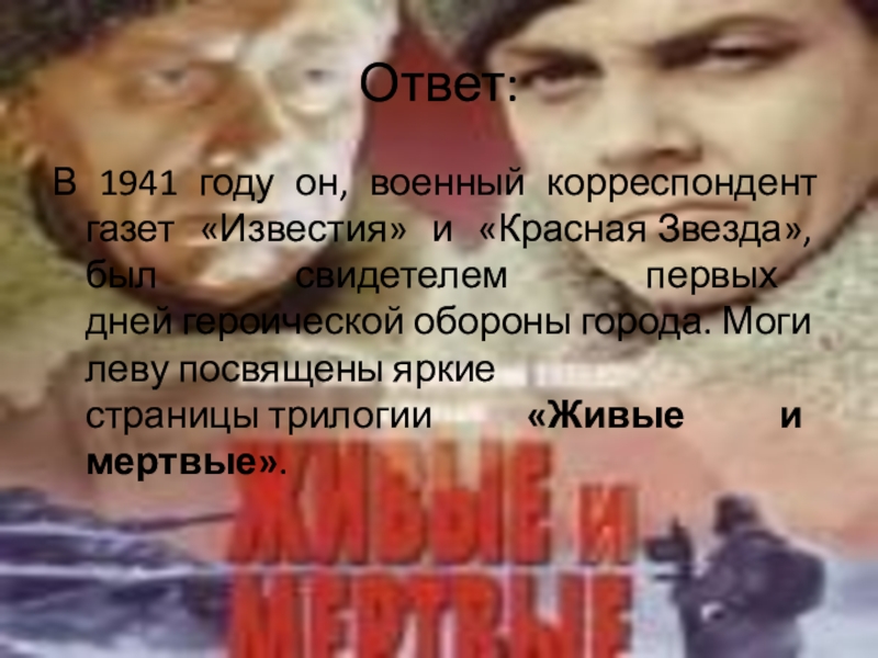 Ответ:В 1941 году он, военный корреспондент газет «Известия» и «Красная Звезда», был свидетелем первых дней героической обороны города. Могилеву посвящены яркие страницы трилогии «Живые и