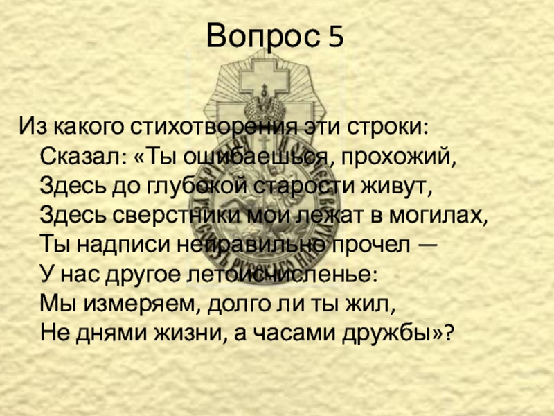 Вопрос 5Из какого стихотворения эти строки: Сказал: «Ты ошибаешься, прохожий, Здесь до глубокой старости живут, Здесь сверстники