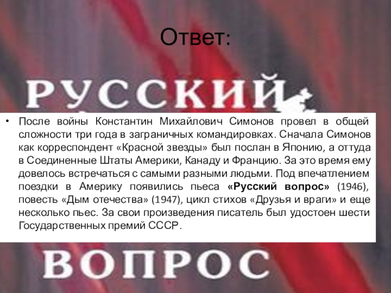 в заграничных командировках. Сначала Симонов как корреспондент «Красной звезды» был послан в Японию, а оттуда в Соединенные Штаты Америки, Канаду и Францию. За это время ему довелось встречаться с самыми разными людьми. Под впечатлением поездки в Америку появились пьеса «Русский вопрос» (1946), повесть «Дым отечества» (1947), цикл стихов «Друзья и враги» и еще несколько пьес. За свои произведения писатель был удостоен шести Государственных премий СССР.