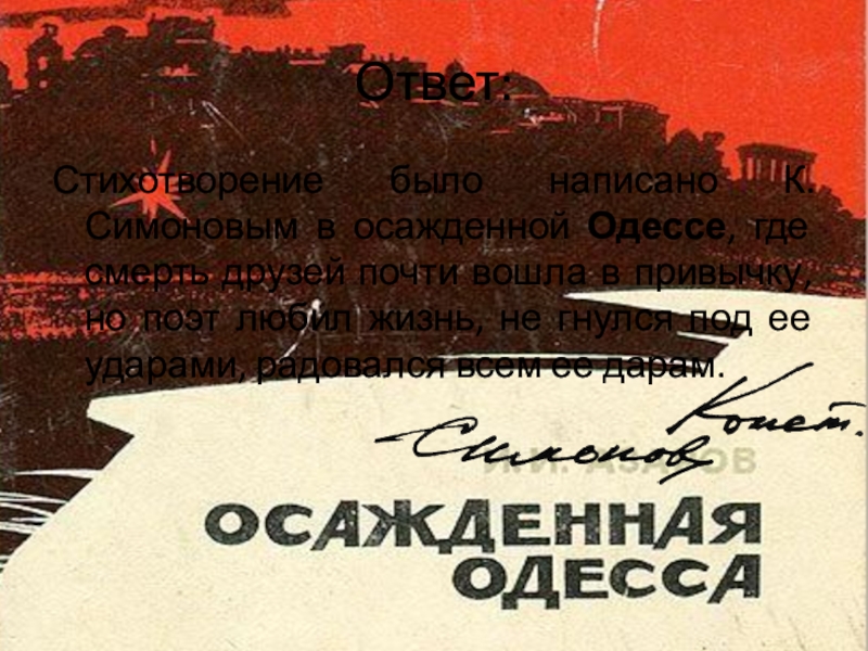 Ответ:Стихотворение было написано К.Симоновым в осажденной Одессе, где смерть друзей почти вошла в привычку, но поэт любил