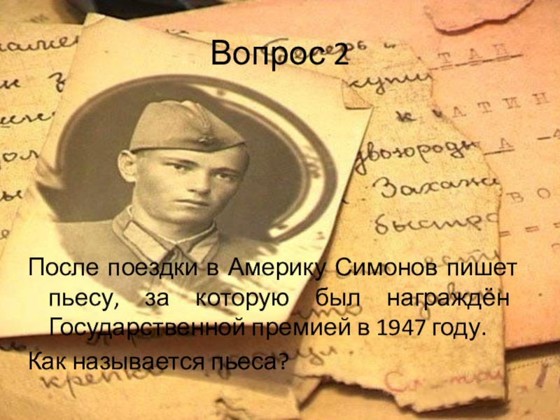 Вопрос 2После поездки в Америку Симонов пишет пьесу, за которую был награждён Государственной премией в 1947 году.