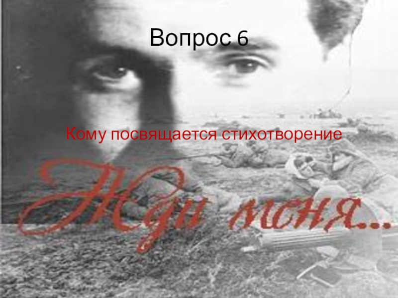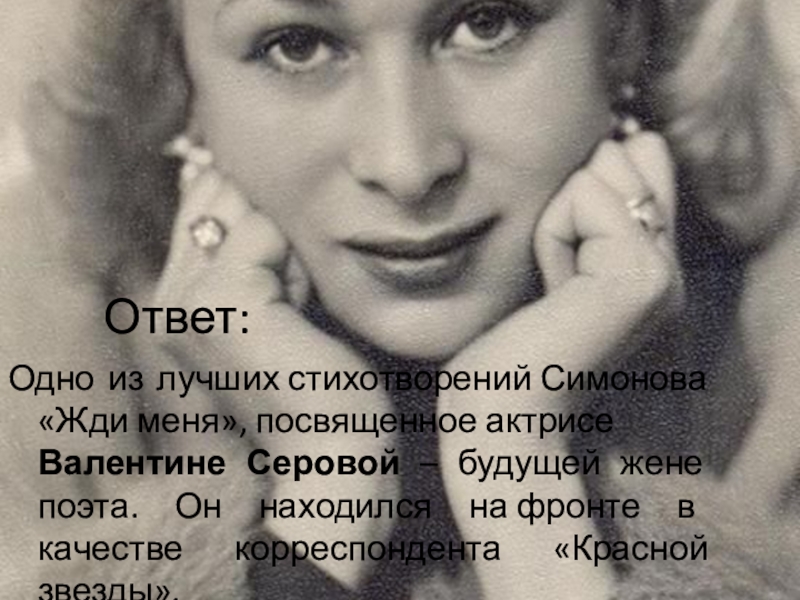 Ответ:Одно из лучших стихотворений Симонова «Жди меня», посвященное актрисе Валентине Серовой – будущей жене поэта. Он находился на фронте в качестве корреспондента «Красной