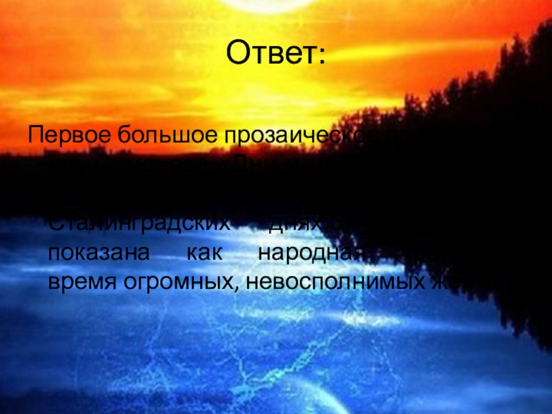 Ответ:Первое большое прозаическое произведение Симонова «Дни и ночи» (1943-1944) - суровая, аскетическая повесть о Сталинградских днях. Здесь война показана как народная трагедия,