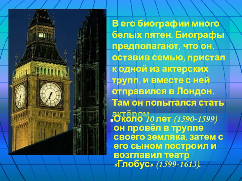 Около 10 лет (1590-1599) он провёл в труппе своего земляка, затем с его сыном построил и возглавил театр «Глобус» (1599-1613).