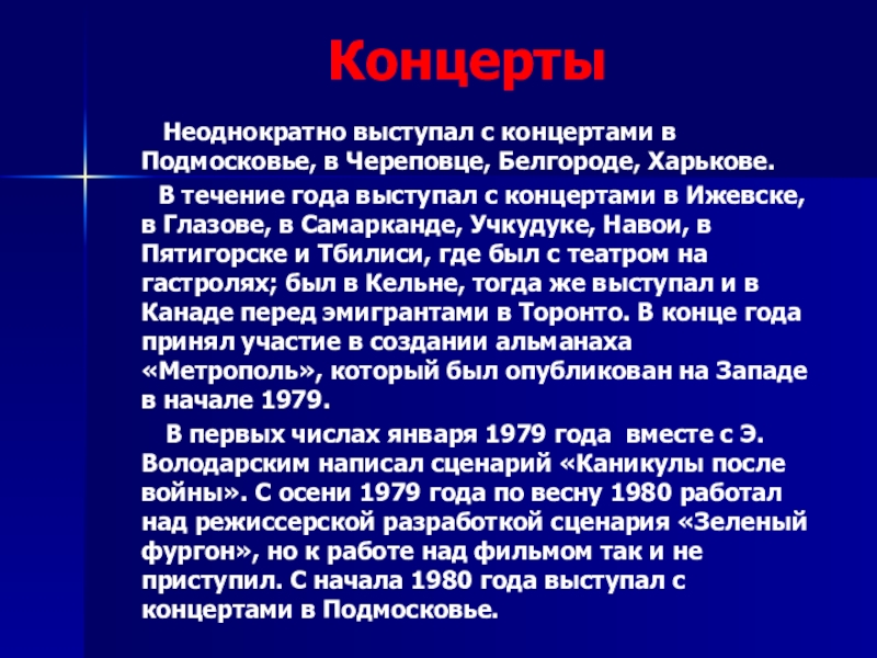 В первых числах января 1979 года вместе с Э.Володарским написал сценарий «Каникулы после войны». С осени 1979 года по весну 1980 работал над режиссерской разработкой сценария «Зеленый фургон», но к работе над фильмом так и не приступил. С начала 1980 года выступал с концертами в Подмосковье.