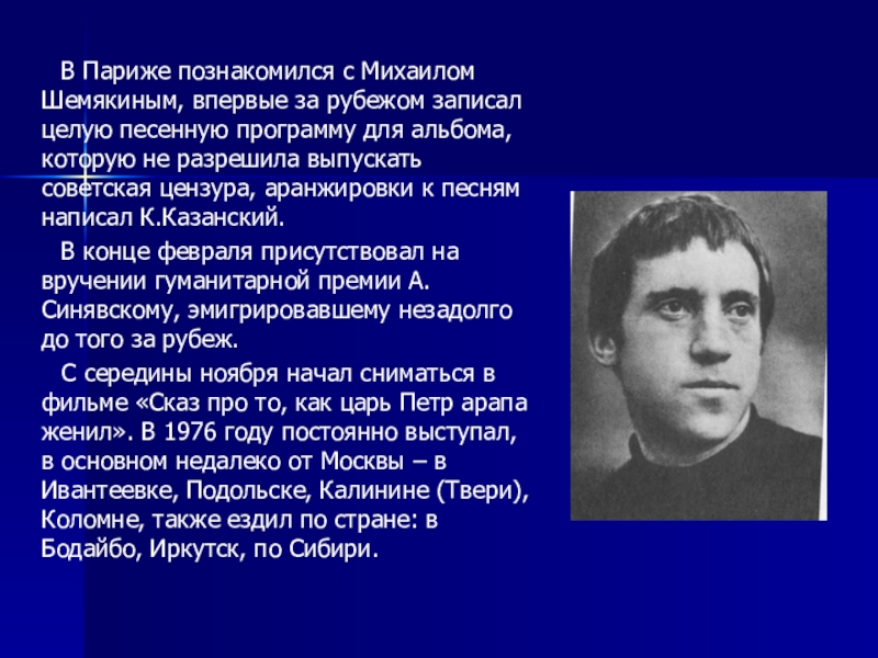 С середины ноября начал сниматься в фильме «Сказ про то, как царь Петр арапа женил». В 1976 году постоянно выступал, в основном недалеко от Москвы – в Ивантеевке, Подольске, Калинине (Твери), Коломне, также ездил по стране: в Бодайбо, Иркутск, по Сибири.