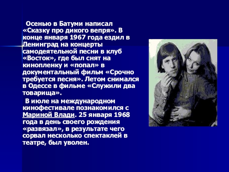 В июле на международном кинофестивале познакомился с Мариной Влади. 25 января 1968 года в день своего рождения «развязал», в результате чего сорвал несколько спектаклей в театре, был уволен.