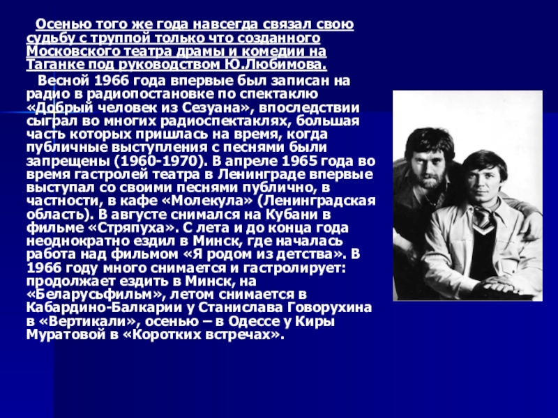Весной 1966 года впервые был записан на радио в радиопостановке по спектаклю «Добрый человек из Сезуана», впоследствии сыграл во многих радиоспектаклях, большая часть которых пришлась на время, когда публичные выступления с песнями были запрещены (1960-1970). В апреле 1965 года во время гастролей театра в Ленинграде впервые выступал со своими песнями публично, в частности, в кафе «Молекула» (Ленинградская область). В августе снимался на Кубани в фильме «Стряпуха». С лета и до конца года неоднократно ездил в Минск, где началась работа над фильмом «Я родом из детства». В 1966 году много снимается и гастролирует: продолжает ездить в Минск, на «Беларусьфильм», летом снимается в Кабардино-Балкарии у Станислава Говорухина в «Вертикали», осенью – в Одессе у Киры Муратовой в «Коротких встречах».