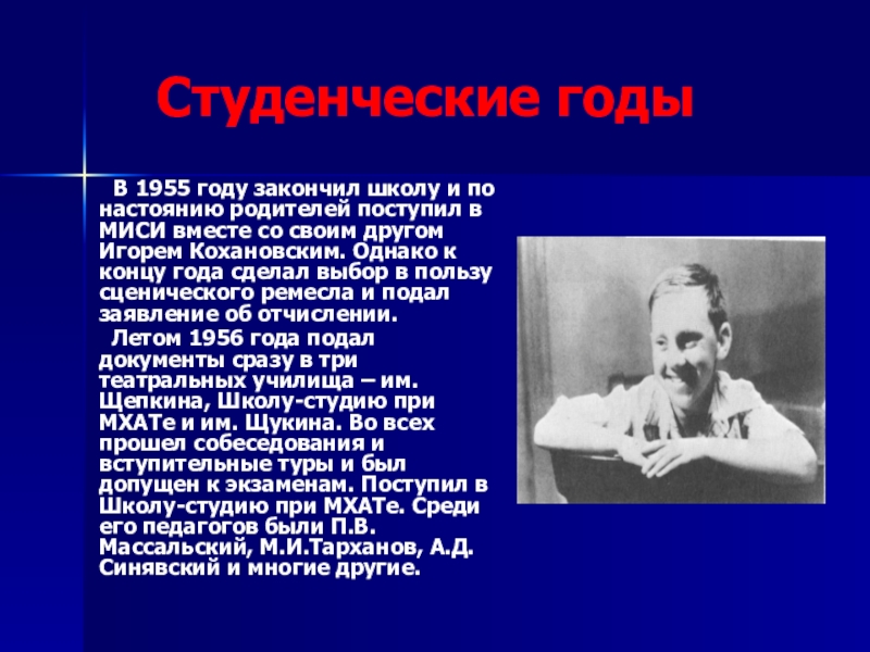 школу и по настоянию родителей поступил в МИСИ вместе со своим другом Игорем Кохановским. Однако к концу года сделал выбор в пользу сценического ремесла и подал заявление об отчислении.