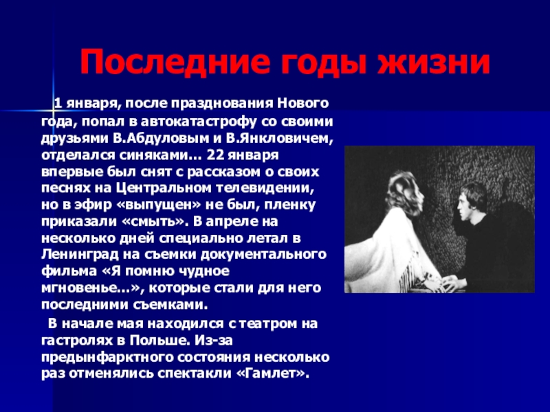 года, попал в автокатастрофу со своими друзьями В.Абдуловым и В.Янкловичем, отделался синяками… 22 января впервые был снят с рассказом о своих песнях на Центральном телевидении, но в эфир «выпущен» не был, пленку приказали «смыть». В апреле на несколько дней специально летал в Ленинград на съемки документального фильма «Я помню чудное мгновенье…», которые стали для него последними съемками.