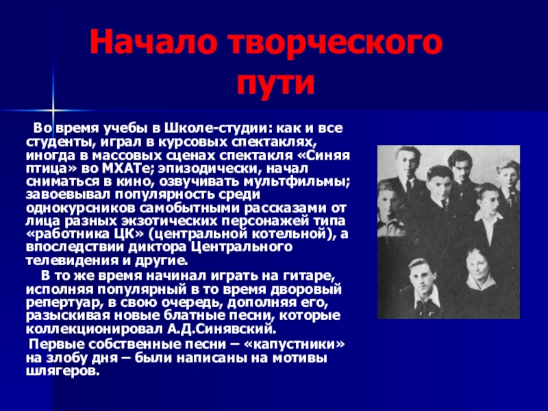 В то же время начинал играть на гитаре, исполняя популярный в то время дворовый репертуар, в свою очередь, дополняя его, разыскивая новые блатные песни, которые коллекционировал А.Д.Синявский.