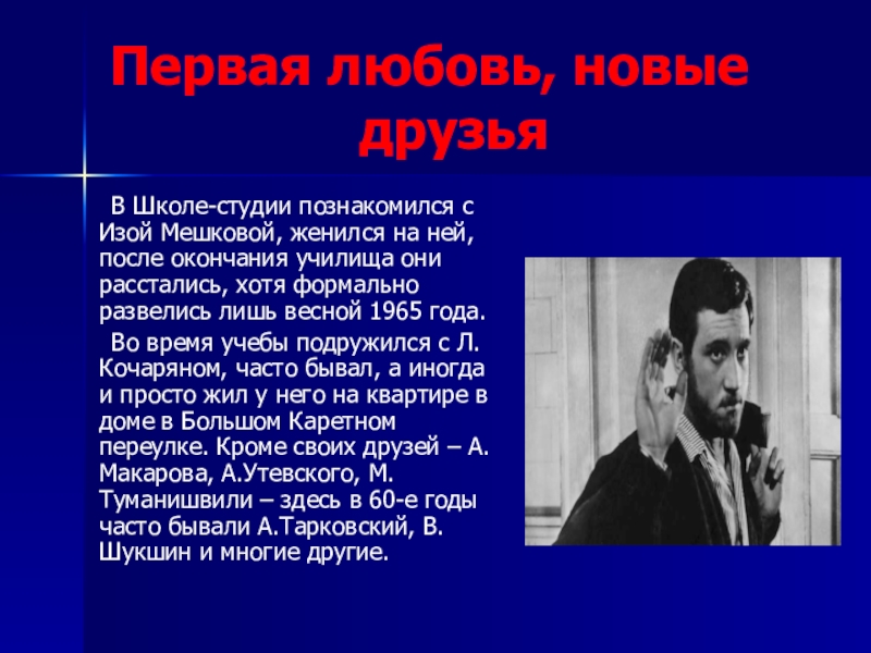Во время учебы подружился с Л.Кочаряном, часто бывал, а иногда и просто жил у него на квартире в доме в Большом Каретном переулке. Кроме своих друзей – А.Макарова, А.Утевского, М.Туманишвили – здесь в 60-е годы часто бывали А.Тарковский, В.Шукшин и многие другие.