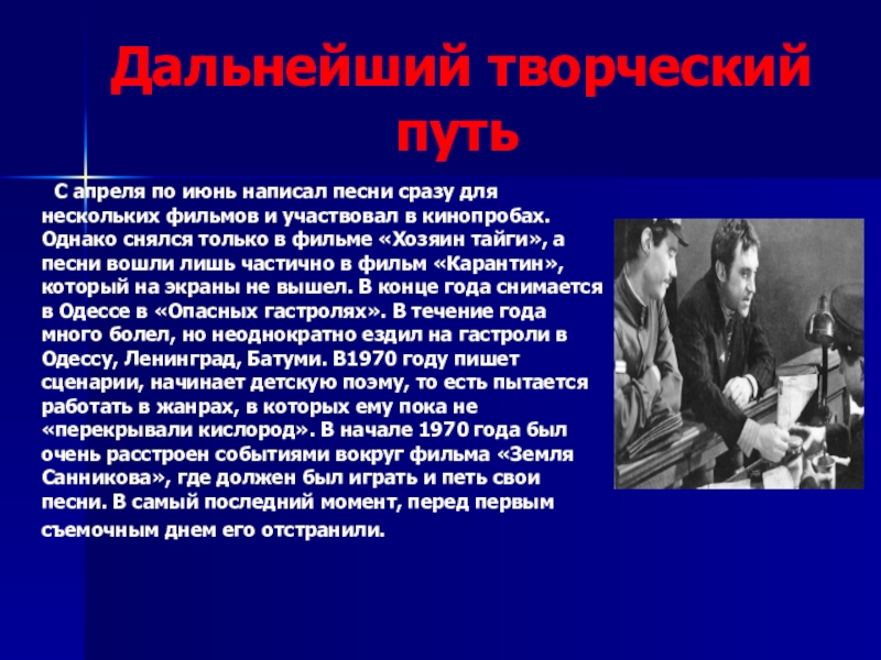 С апреля по июнь написал песни сразу для нескольких фильмов и участвовал в кинопробах. Однако снялся только в фильме «Хозяин тайги», а песни вошли лишь частично в фильм «Карантин», который на экраны не вышел. В конце года снимается в Одессе в «Опасных гастролях». В течение года много болел, но неоднократно ездил на гастроли в Одессу, Ленинград, Батуми. В1970 году пишет сценарии, начинает детскую поэму, то есть пытается работать в жанрах, в которых ему пока не «перекрывали кислород». В начале 1970 года был очень расстроен событиями вокруг фильма «Земля Санникова», где должен был играть и петь свои песни. В самый последний момент, перед первым съемочным днем его отстранили.